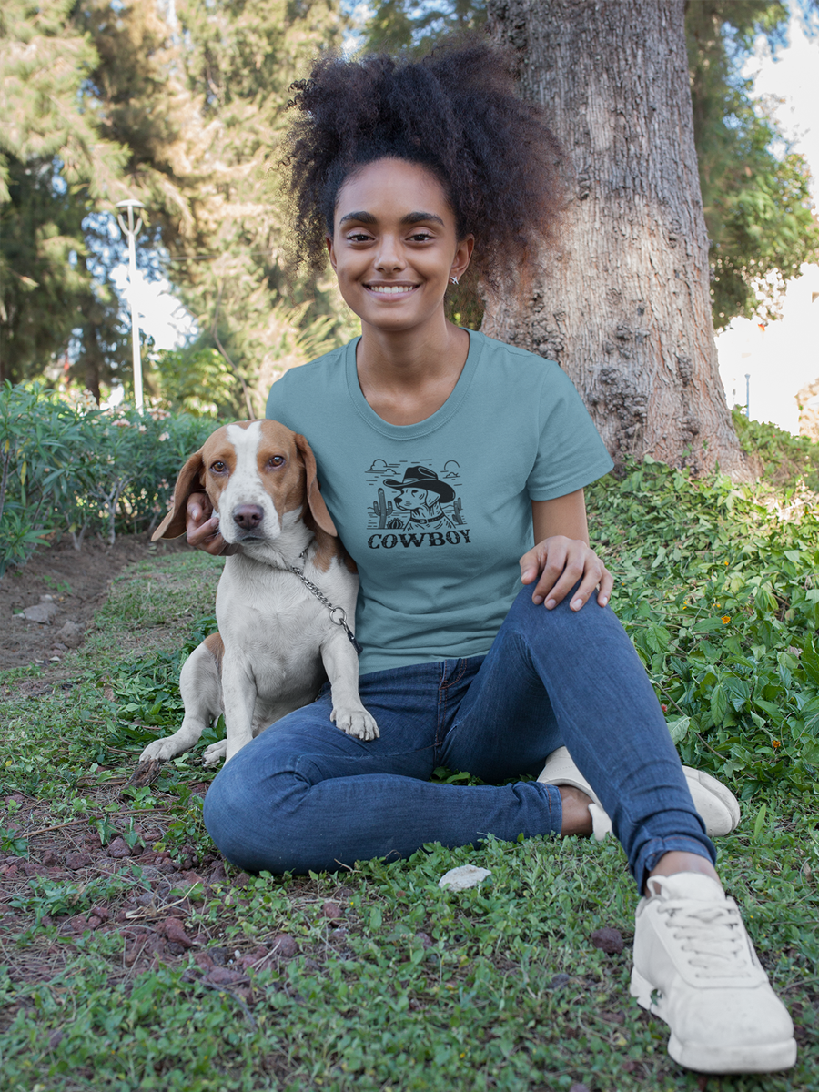This "Cowboy" Western-style dog t-shirt brings bold, vintage charm to your wardrobe. Perfect for dog lovers who appreciate classic cowboy aesthetics, Western culture, and a touch of rugged style with their furry companion.
