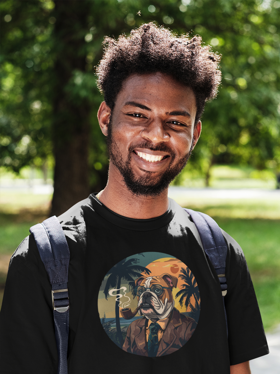 This “Gentleman Bulldog” T-shirt showcases a vintage-style bulldog dressed in a suit, tie, and glasses. Soft, comfortable, and perfect for those who love dogs with personality. A charming and stylish gift for bulldog lovers and fans of retro animal art.