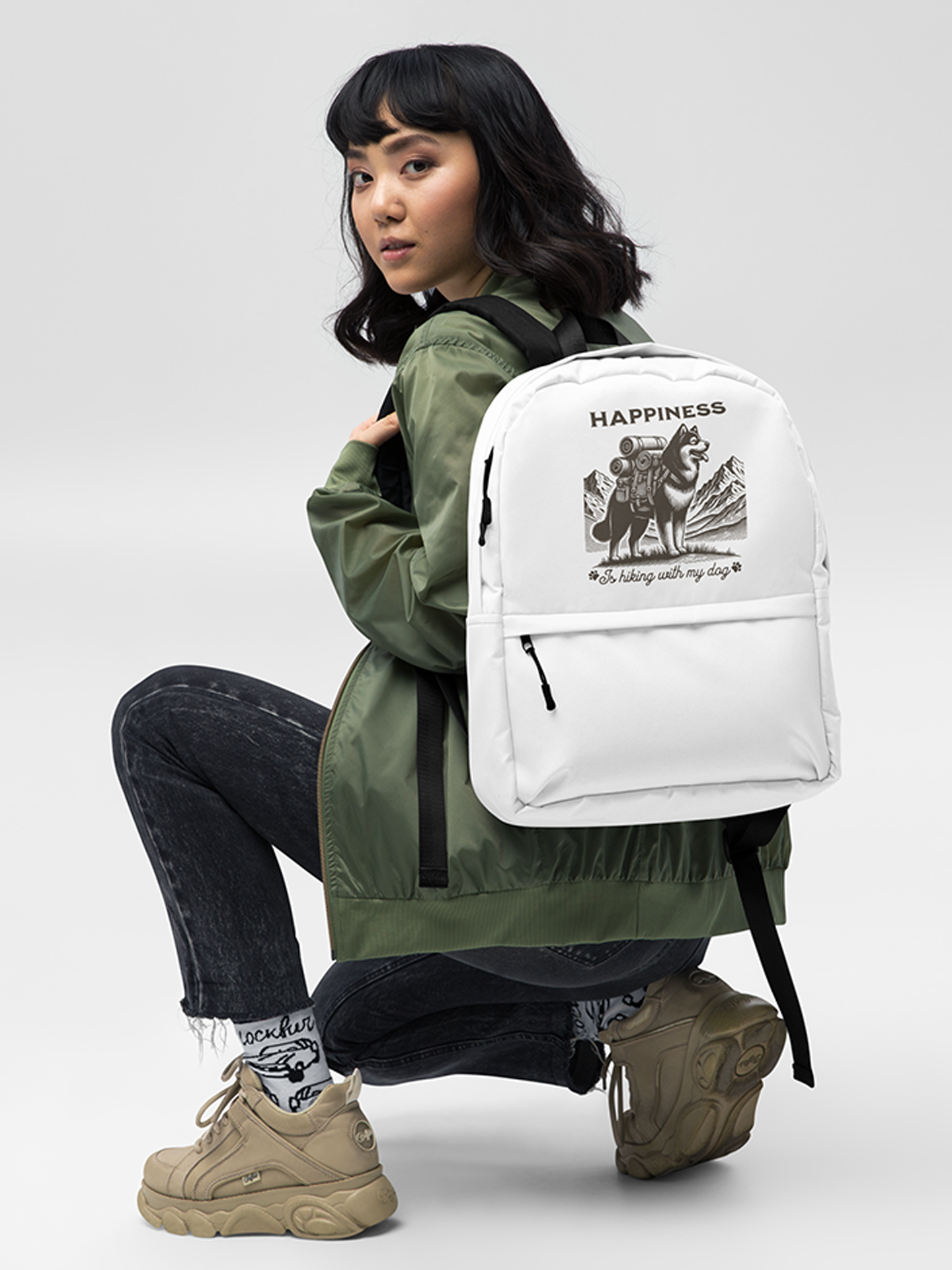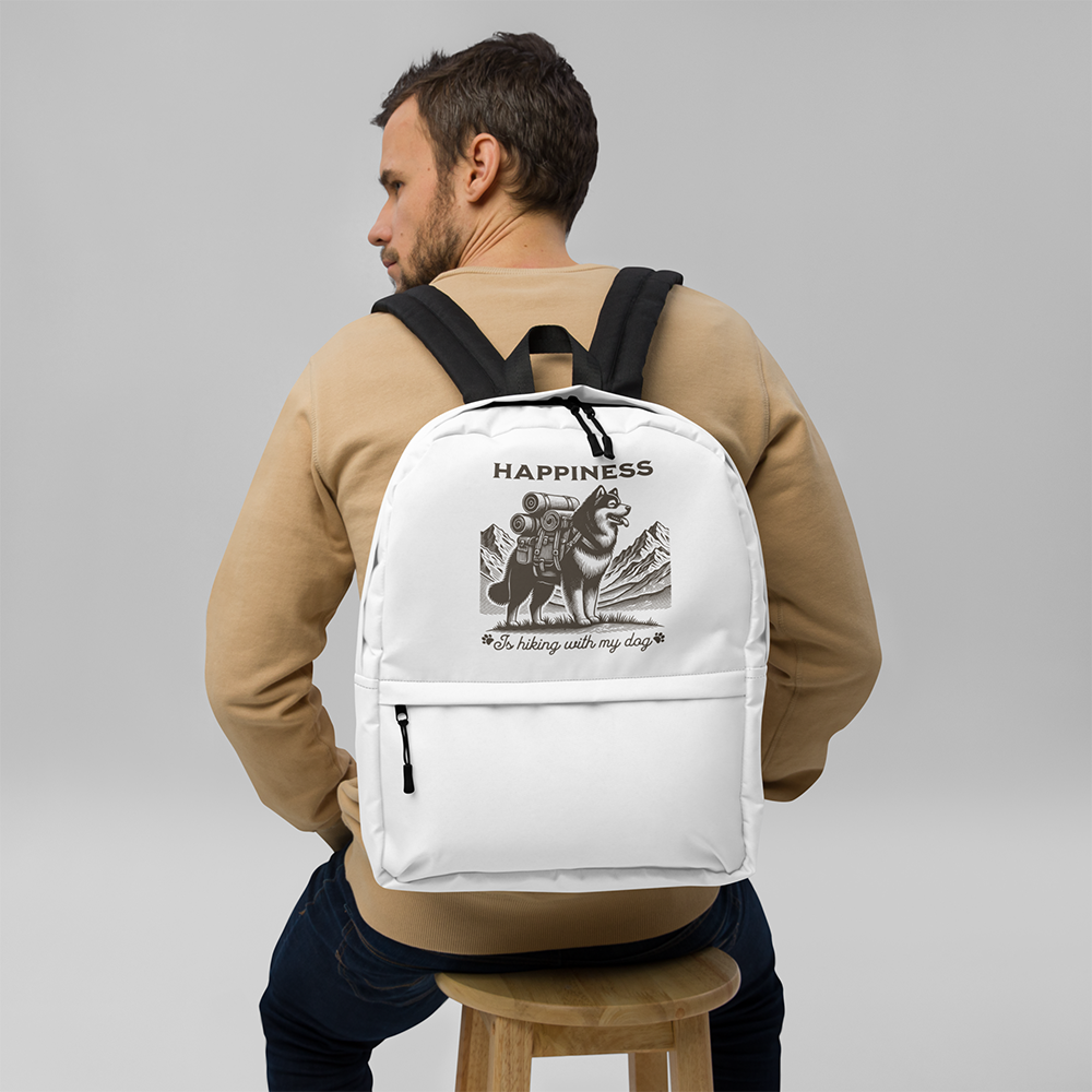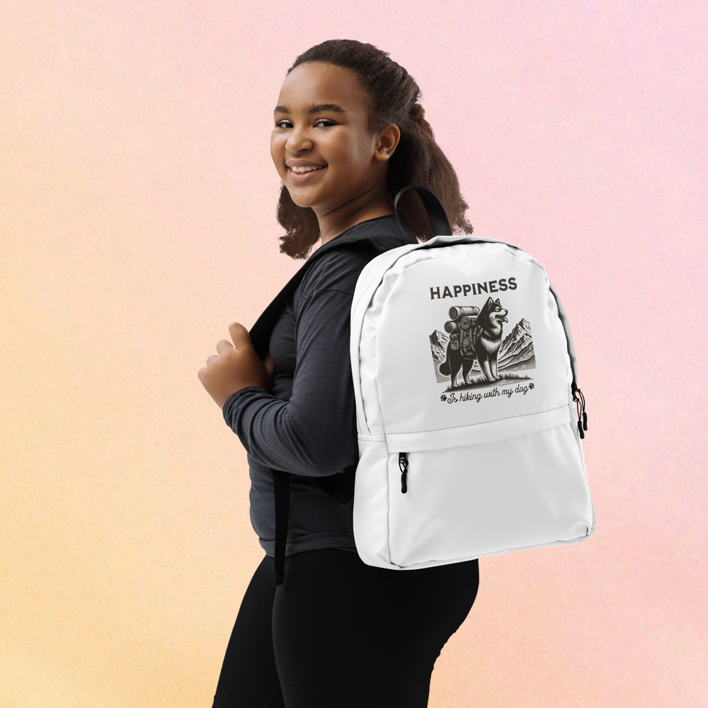 - Lightweight, durable and roomy backpack with an adorable print of a traveling dog and the inscription "Happiness is hiking with my dog" is perfect for active weekends, trips out of town or just everyday life.