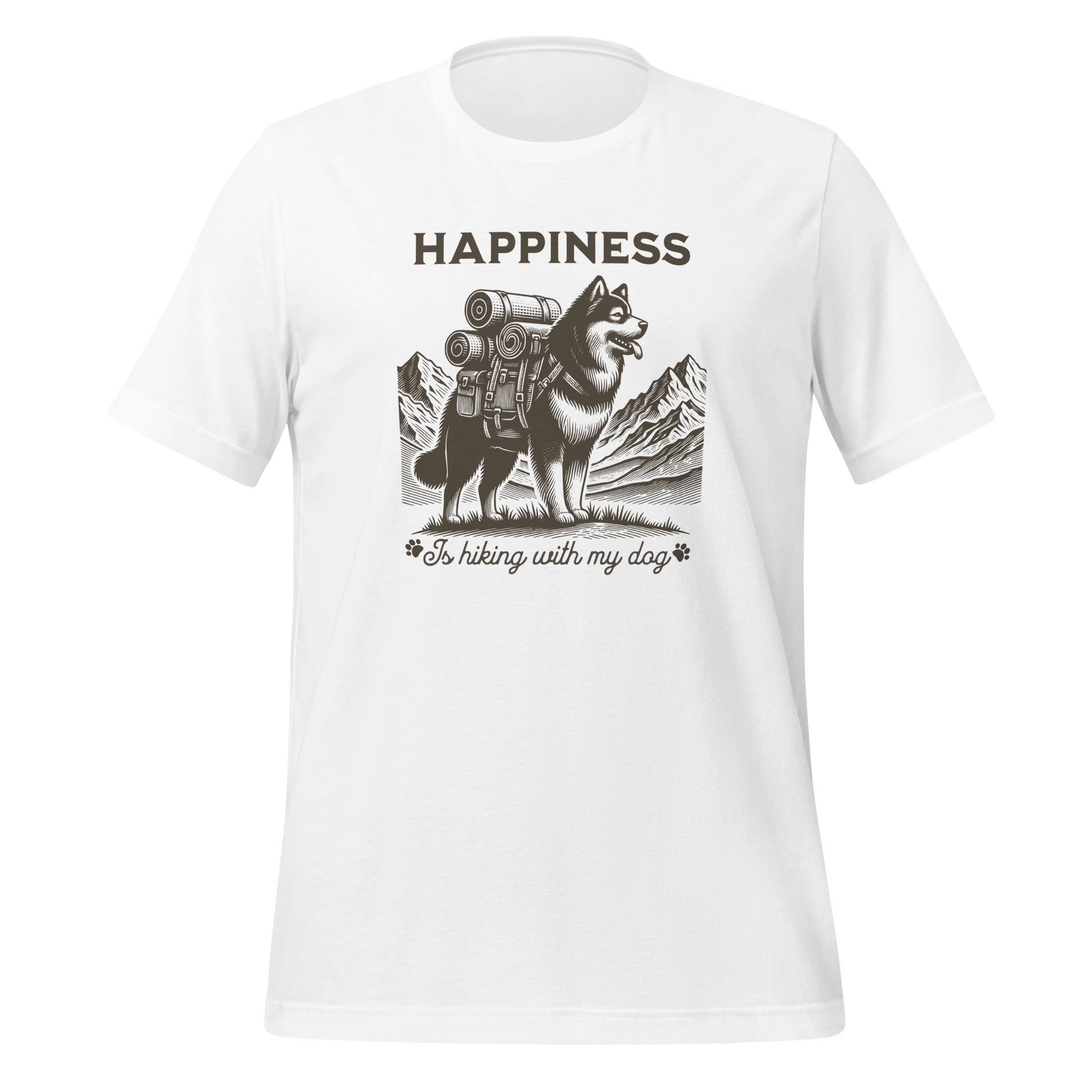 With its fun print and "Happiness is hiking with my dog" slogan, this t shirt made for real adventures with your four-legged friend. The print is applied with care and attention to detail. Made from soft, breathable 100% cotton, this comfortable unisex shirt is perfect for hiking, traveling and the perfect gift for dog lovers.