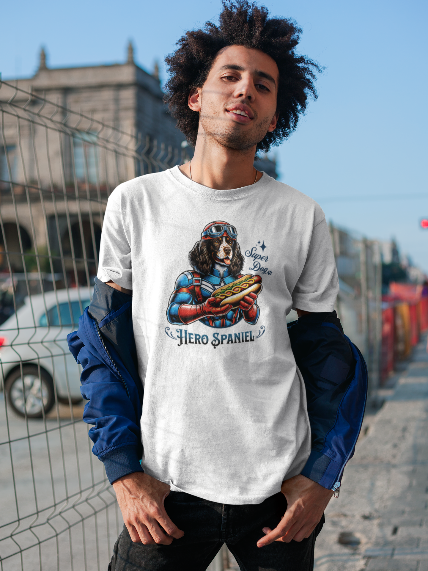 Show off your super sidekick with the “Hero Spaniel” t-shirt! Crafted from premium 100% cotton, it's soft, breathable, and great for both adventures and lazy days. The quirky print adds personality and charm to any dog lover’s wardrobe. Makes an ideal gift for cocker spaniel owners or anyone who sees their dog as a superhero.
