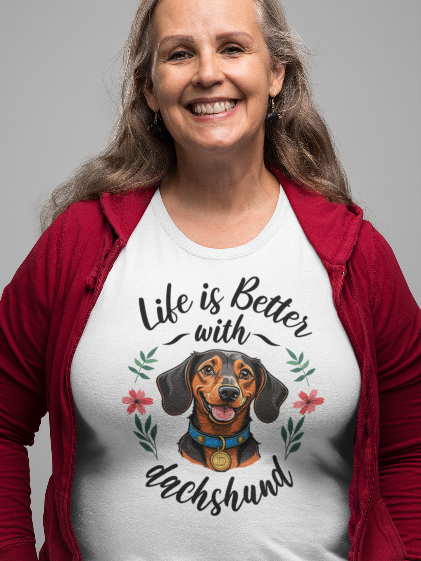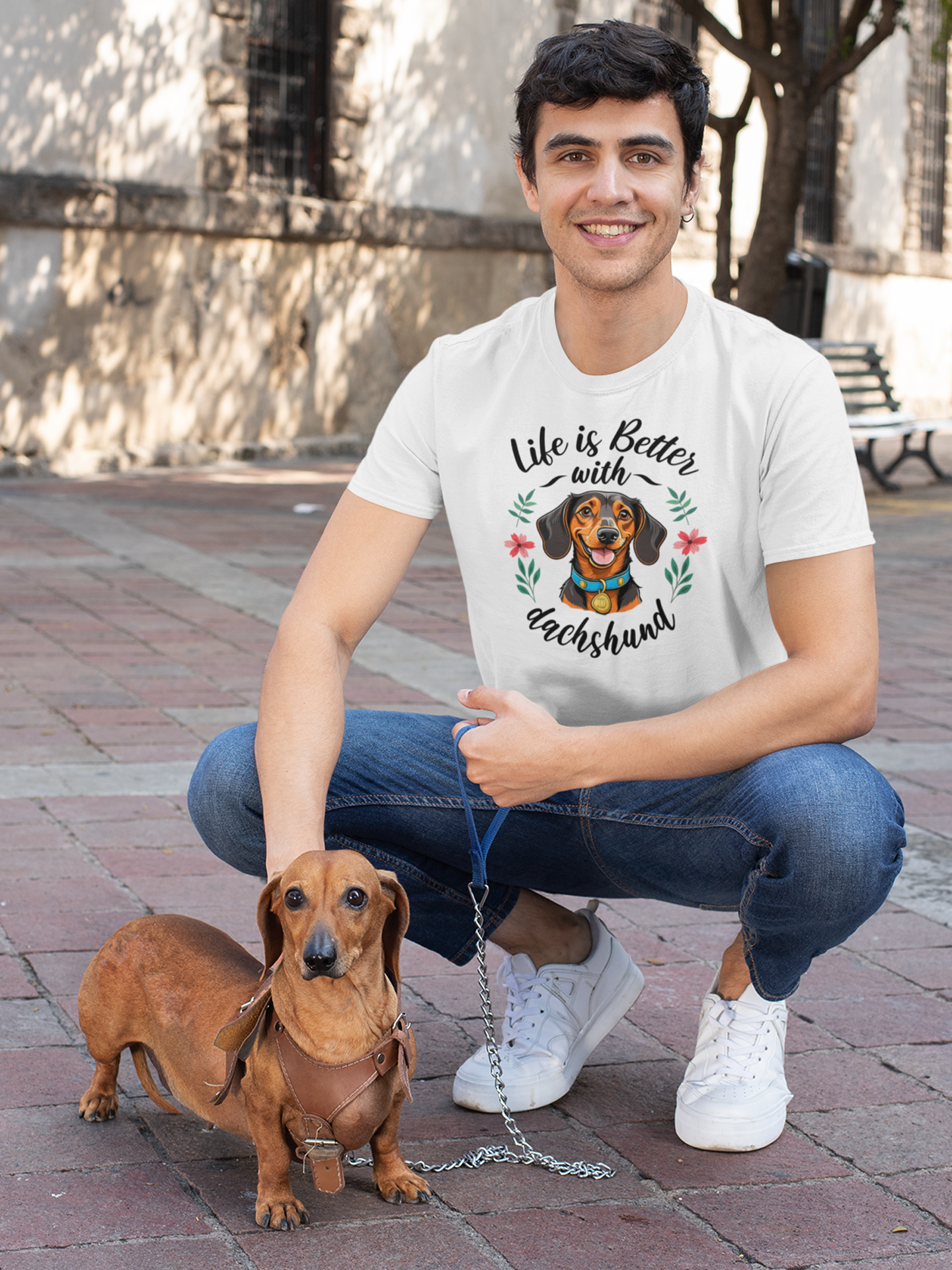 - Celebrate your love for dachshunds with the cozy “Life is Better with Dachshund” t-shirt, showcasing an adorable sausage dog graphic. Crafted from ultra-soft, breathable 100% cotton, it’s ideal for relaxed weekends, morning coffee walks, and casual outings. A sweet and charming gift for dachshund lovers.
